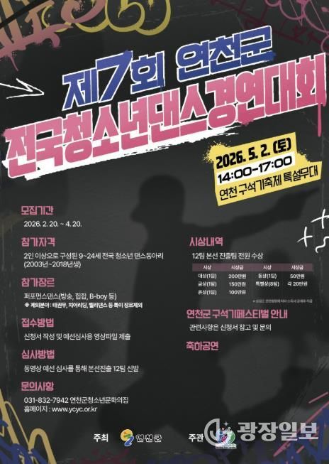 광장일보 주재영 기자 | (재)연천군청소년육성재단(청소년문화의집)은 전국 청소년들이 꿈과 열정을 마음껏 펼칠 수 있는 무대를 마련하고, 창의적인 문화예술 활동을 확산하기 위해 제7회 연천군 전국청소년댄스경연대회를 개최한다고 밝혔다.