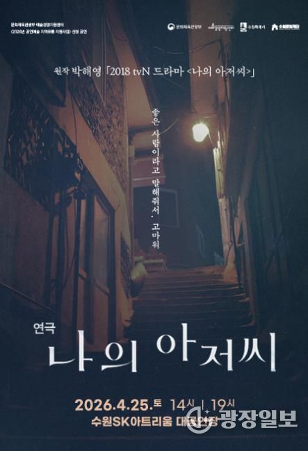 수원문화재단 관계자는 “수원SK아트리움은 전 세대가 공감할 수 있는 우수한 기획 공연을 꾸준히 선보여 왔다”며, “이번 ‘나의 아저씨’에서는 각자의 삶을 돌아보게 하는 따뜻한 이야기를 선보일 예정으로, 가족, 연인, 친구와 함께 공연장에서 봄날의 특별한 시간을 보내시길 바란다”고 전했다.