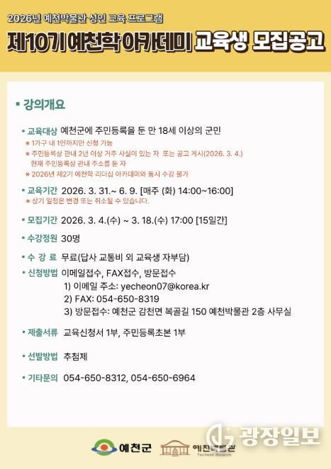 광장일보 주재영 기자 | 예천군은 2026년 상반기 ‘예천학 및 예천학 리더십 아카데미’ 교육생을 18일까지 모집한다.