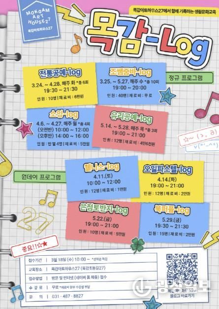 광장일보 주재영 기자 | 시흥시는 목감아트하우스27에서 운영하는 상반기 생활문화교육 ‘목감-로그(log)’ 참여자를 모집한다.