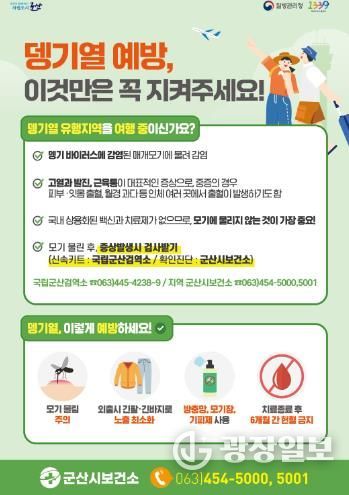 광장일보 주재영 기자 | 군산시보건소는 지난해 지역거점 뎅기열 예방관리 사업을 통해 감시체계 구축과 예방홍보 활동을 체계적으로 추진해 왔으며, 올해도 뎅기열 예방관리 사업을 지속 추진한다고 밝혔다.