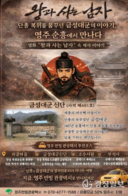 광장일보 주재영 기자 | 영주시는 관광객들이 반띵 관광택시를 이용해 영화 '왕과 사는 남자' 속 역사 이야기를 따라 순흥 일대의 주요 관광지를 둘러볼 수 있도록 추천 여행 코스를 소개했다.