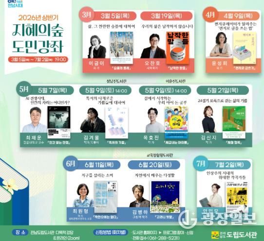 광장일보 주재영 기자 | 전남도립도서관은 도민의 인문 소양을 높이고, 생활 속 독서 문화 확산을 위해 5일부터 ‘지혜의 숲 도민강좌’ 운영에 들어갔다.
