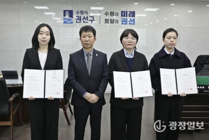 광장일보 박균현 기자 | 수원시 권선구는 지난 5일, 권선구청 2층 집무실에서 신규 공직자 3명이 참석한 가운데 임용장 수여식을 개최했다.