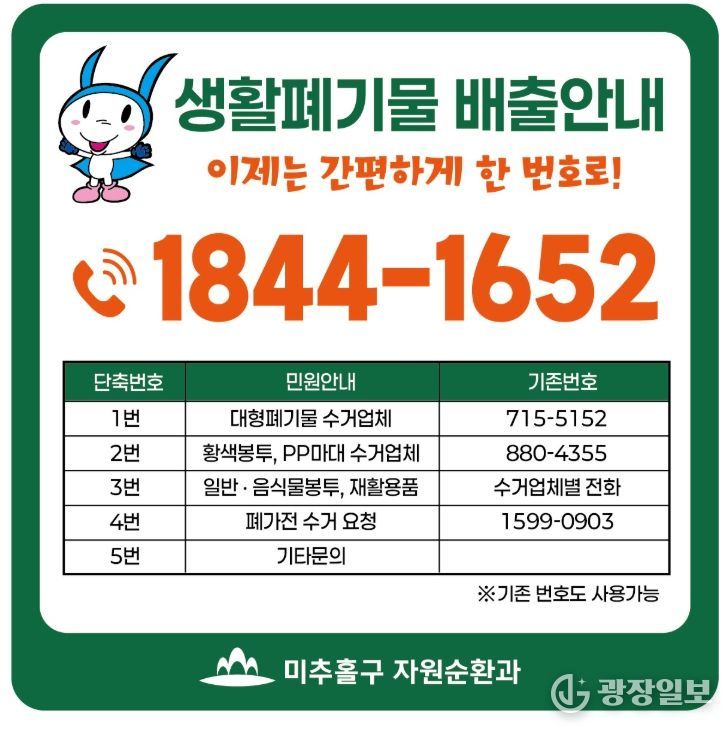 광장일보 주재영 기자 | 인천 미추홀구가 주민들의 생활폐기물 배출 편의를 획기적으로 개선하기 위해 ‘생활폐기물 대표번호 자동응답 서비스(1844-1652)’를 3월부터 본격 시행한다고 밝혔다.