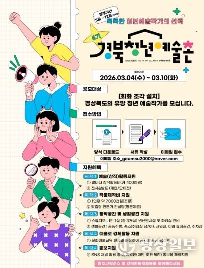 광장일보 주재영 기자 | 성주군은 지역 청년 예술인의 창작 활동을 지원하고 문화예술 생태계를 확장하기 위해 2월 24일부터 3월 10일 13시까지 ‘2026년 경북청년예술촌 입주작가’를 공개 모집한다.