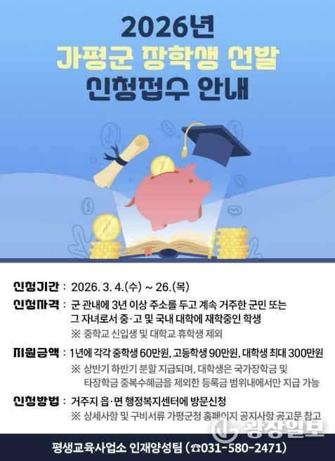 광장일보 주재영 기자 | 가평군이 지역 학생들의 균등한 교육 기회를 보장하고 우수 인재를 육성하기 위해 2026년도 장학생 선발에 나선다.