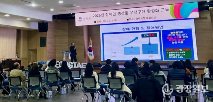 광장일보 박균현 기자 | 평택시는 지난 5일 시청 본관 2층 대회의실에서 평택시 공무원을 대상으로 '2026년 장애인생산품 우선구매 활성화 교육’을 실시했다.