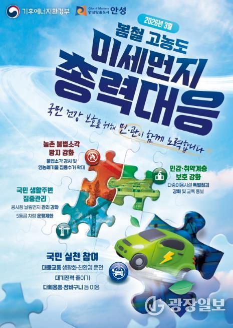 광장일보 주재영 기자 | 안성시는 고농도 미세먼지 발생이 빈번한 봄철을 맞아 시민 건강 보호를 위해 3월 한달 간 ‘초미세먼지 봄철 총력대응’을 추진한다고 밝혔다.