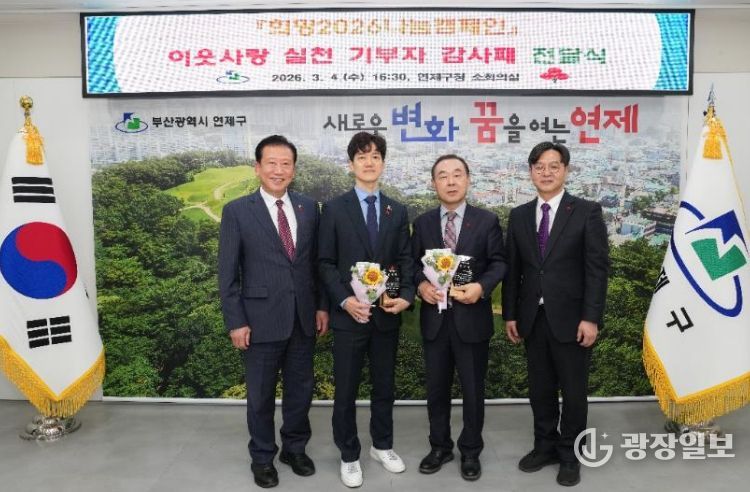 광장일보 주재영 기자 | 연제구는 지난 3월 4일, 부산사회복지공동모금회(회장 이수태)와 함께 '희망2026나눔캠페인 이웃사랑 실천 기부자'에게 감사패를 전달했다.