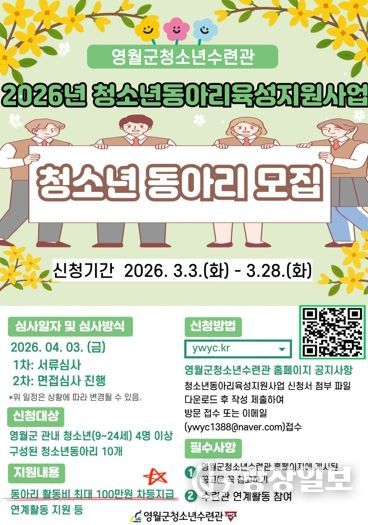 광장일보 이현나 기자 | 영월군청소년수련관은 지역 청소년들의 자율적인 참여와 성장을 지원하기 위해 ‘2026년 영월군청소년수련관 청소년동아리육성지원사업’에 참여할 청소년 동아리를 모집한다.