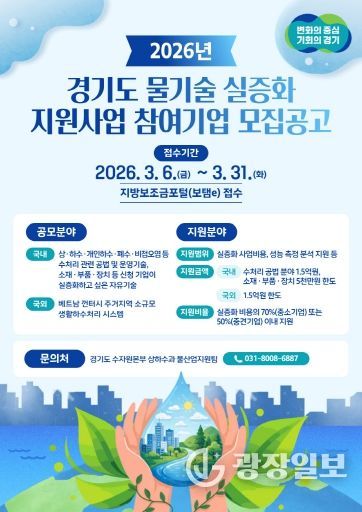 광장일보 박균현 기자 | 경기도가 ‘2026년 경기도 물기술 실증화 지원사업’ 참여 기업을 공개 모집한다.