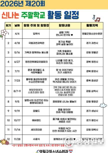 광장일보 이현나 기자 | 영월군청소년수련관은 오는 3월 14일 오전 10시부터 수련관 로비에서 제20회 ‘신나는 주말학교’ 참가자를 선착순으로 접수한다.