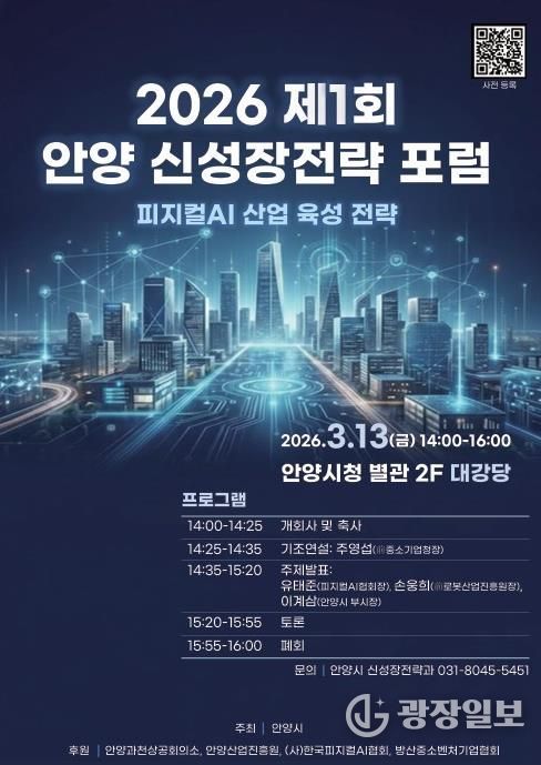 광장일보 주재영 기자 | 안양시는 미래 신산업 육성과 지역 산업 경쟁력 강화를 모색하기 위한 ‘2026 제1회 안양 신성장전략 포럼’을 이달 13일 오후 2시 안양시청 별관 2층 대강당에서 개최한다고 9일 밝혔다.