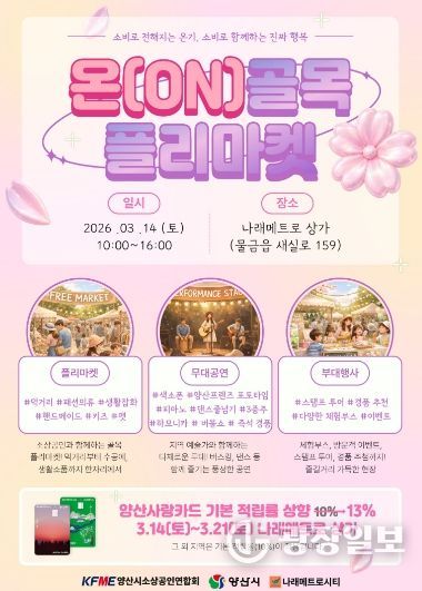 광장일보 주재영 기자 | 양산시 소상공인연합회(회장 우현욱)에서 골목상권 활성화와 지역 상인들의 판로 확대를 위해‘온(ON)골목 플리마켓’을 3월 14일(토) 나래메트로시티 상가(양산시 골목형상점가 1호), 3월 21일 덕계무지개상점가(양산시 골목형상점가 2호) 인근 덕계2임시 공영주차장에서 개최한다고 밝혔다.