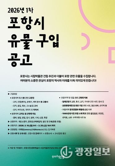 광장일보 주재영 기자 | 포항시는 시립박물관 건립을 위한 전시 자원 확보를 위해 오는 16일부터 20일까지 ‘2026년 1차 포항시 유물 구입’을 진행한다고 밝혔다.