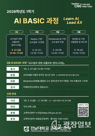 10일 전남대에 따르면, 전남대학교 교육혁신본부(본부장 정은경)는 2026학년도 1학기 전 교원을 대상으로 ‘AI BASIC 과정’을 운영한다.