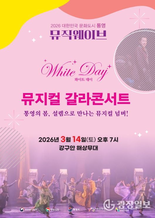 광장일보 주재영 기자 | (재)통영문화재단은 오는 14일 오후 7시 강구안 해상무대에서 2026년 뮤직웨이브 첫 정기 공연으로 뮤지컬 갈라 콘서트‘화이트데이, 설렘으로 만나는 뮤지컬 넘버’공연을 진행한다.