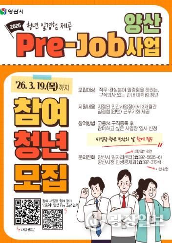 광장일보 주재영 기자 | 양산시는 미취업 청년들에게 직무·관심 분야의 실무경험을 제공하고 관내 사업장으로의 연계 채용을 활성화하기 위한 ‘2026년 청년 일경험 제공 '양산 Pre-Job 사업'’ 참여 청년을 오는 3월 19일까지 정기 모집한다고 밝혔다.