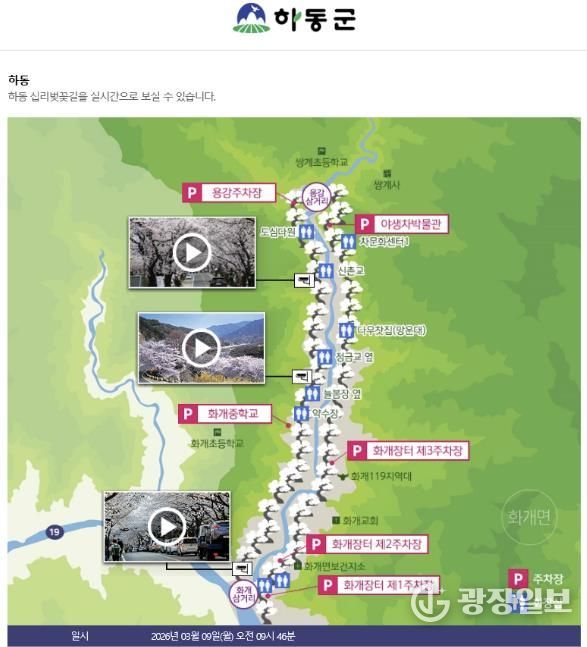 하동군은 3월 10일부터 4월 6일까지, 벚꽃이 만개하는 모습을 지역민과 관광객에게 공유하기 위한 실시간 모니터링 서비스를 운영한다고 밝혔다.