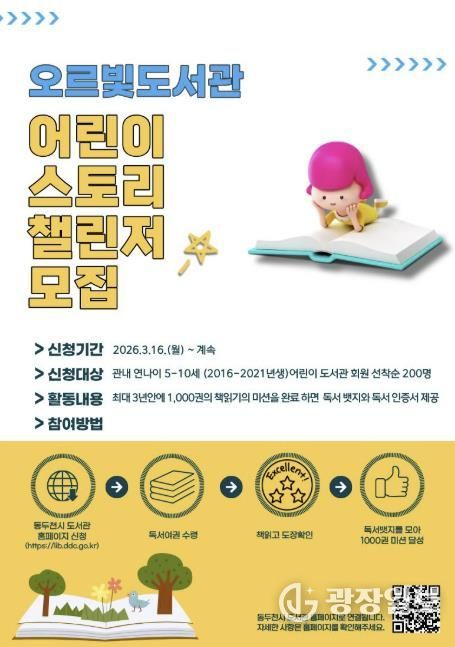 광장일보 주재영 기자 | 동두천시 도서문화사업소는 3월 16일부터 관내 5-10세 어린이를 대상으로 ‘어린이 스토리 챌린저’ 참여자를 모집한다고 밝혔다. 이번 사업은 어린이의 자발적인 독서 습관 형성과 ‘책 읽는 동두천’ 분위기 조성 및 독서문화 확산을 위해 마련했다.