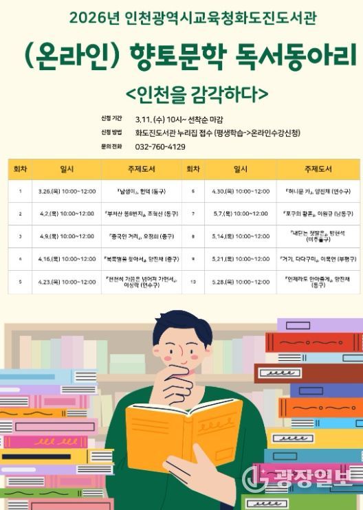 광장일보 주재영 기자 | 인천광역시교육청화도진도서관은 인천 시민의 지역적 정체성과 문학적 감수성을 함양하기 위하여, 오는 11일부터 향토문학 독서동아리 ‘인천을 감각하다’ 참여자를 모집한다.