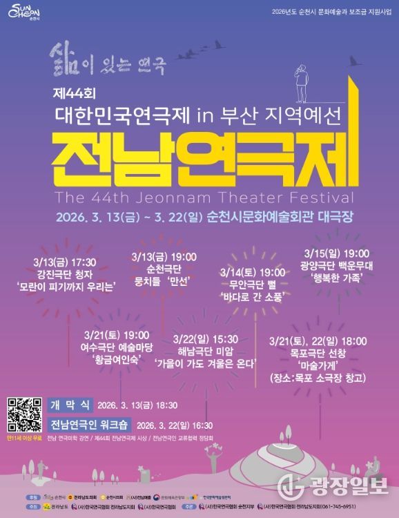 광장일보 주재영 기자 | (사)한국연극협회 순천시지부는 ‘삶이 있는 연극’이라는 주제로 제44회 전남연극제를 오는 13일부터 22일까지 순천문화예술회관 대극장에서 개최한다고 밝혔다.