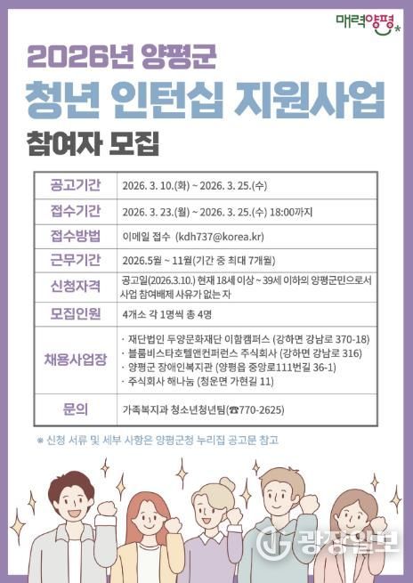 광장일보 주재영 기자 | 양평군은 인력이 필요한 관내 사업장과 미취업 청년을 연계하고 사업장에 인건비를 지원하는 ‘2026년 양평군 청년 인턴십 지원 사업’ 참여자를 모집한다고 10일 밝혔다.