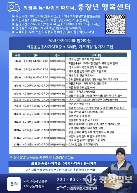 광장일보 주재영 기자 | (재)의정부도시교육재단은 택배 전문 교육기관 택배아카데미와 협력하여, 중장년층의 새로운 도전을 지원하는'화물운송종사자격증+택배업 기초과정'참여자를 3월16일부터 모집한다고 밝혔다.
