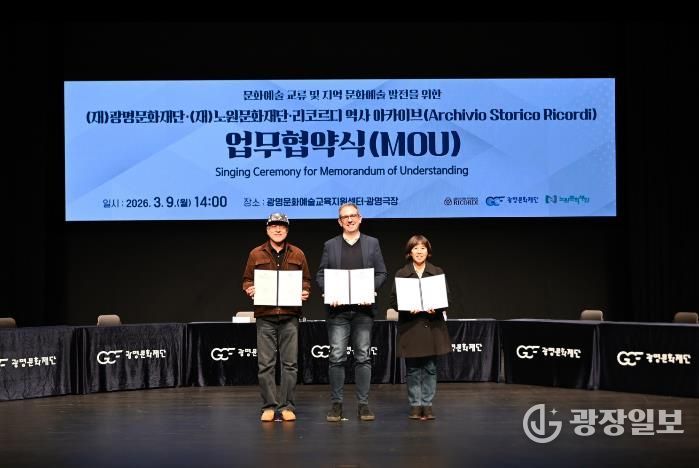 광장일보 주재영 기자 | (재)광명문화재단은 3월 9일 오후 2시 광명극장에서 (재)노원문화재단, 리코르디 역사 아카이브(Archivio Storico Ricordi)(이하 리코르디)와 ‘문화예술 교류 및 지역 문화예술 발전’을 위한 업무협약(MOU)을 체결했다고 밝혔다.