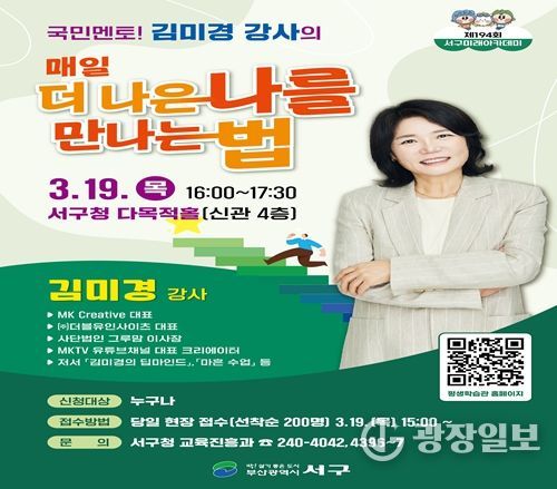 ‘서구미래아카데미’는 주민들의 자기 계발과 삶의 질 향상을 위해 다양한 분야의 명사를 초청해 운영하는 인문·교양 프로그램으로, 매회 높은 관심과 호응을 얻고 있다. 특히 이번 강연은 자기 성장과 마음 관리에 관심 있는 주민들에게 의미 있는 시간이 될 것으로 기대된다.