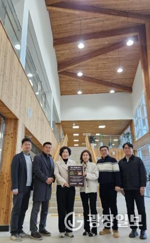 광장일보 주재영 기자 | 전라남도산림연구원은 산림비즈니스센터 내부 목구조 건축물이 한국임업진흥원으로부터 탄소저장량 공식 인증을 획득해 10일 현판식을 개최했다.
