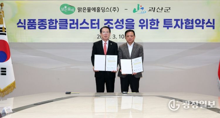 광장일보 이현나 기자 | 충북 괴산군은 10일 서울 여의도 중기중앙회에서 송인헌 군수, 김석원 맑은물에홀딩스(주) 대표이사 등이 참석해 지역 경제 활성화 및 일자리 창출을 위한 식품종합클러스터 조성 투자협약을 체결했다고 밝혔다.