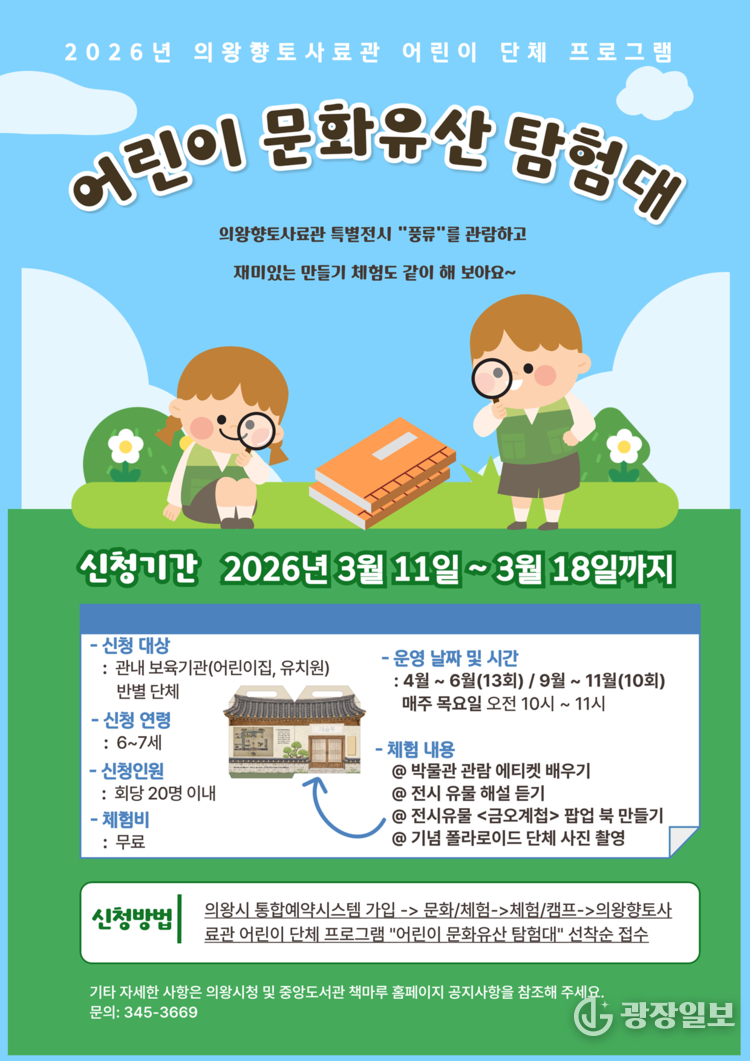 의왕시=주재영 기자 | 의왕시(시장 김성제) 는 향토사료관이 4월부터 6월, 9월부터 10월까지 매주 목요일마다 어린이 단체를 대상으로 '어린이 문화유산 탐험대' 체험 프로그램을 운영한다.