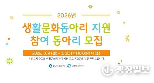 광장일보 주재영 기자 | 인천광역시와 인천문화재단은 인천 시민들의 자발적인 문화예술 활동을 지원하기 위해 '2026 생활문화동아리 지원' 사업을 추진한다.