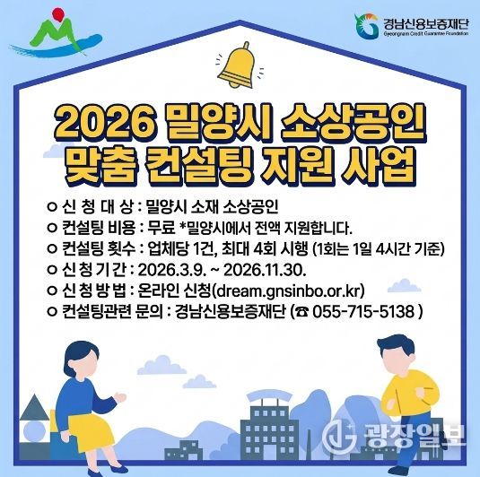 광장일보 주재영 기자 | 경남 밀양시는 관내 소상공인의 자생력을 높이고 경영 안정을 도모하기 위해 ‘2026년 소상공인 맞춤 컨설팅 지원사업’을 추진한다고 11일 밝혔다.