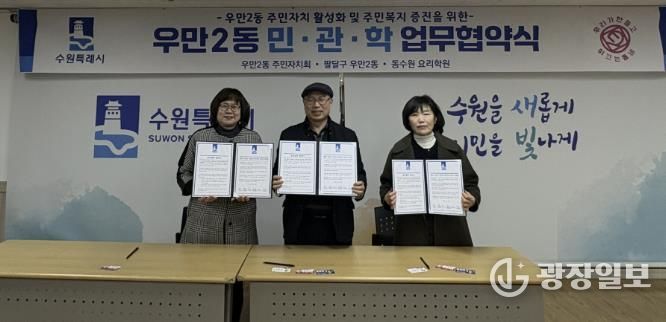 광장일보 박균현 기자 | 수원시 팔달구 우만2동 주민자치회는 지난 10일, 우만2동‧동수원요리학원과 함께 협력사업 추진을 위한 민‧관‧학 협약을 체결했다.