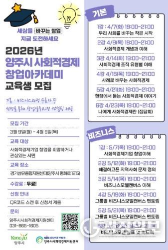 광장일보 주재영 기자 | 양주시와 양주시사회적경제지원센터가 지역 내 사회적경제 인식을 확산하고, 사회적경제 교육을 통한 예비 창업가ㆍ사회적경제 분야 인력양성을 하기 위해 ‘2026년 양주시 사회적경제 창업아카데미 기본ㆍ비즈니스 과정’ 교육생을 오는 4월 9일까지 모집한다.