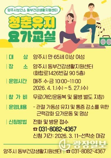 ‘청춘유지 요가교실’은 만 65세 이상 양주시 여성을 대상으로 하며, 참여 신청은 3월 11일부터 전화 또는 방문을 통해 접수할 수 있다.