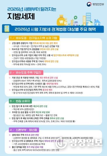 광장일보 주재영 기자 | 경남 밀양시는 2026년 인구감소 대응과 지역경제 활성화를 위해 달라진 지방세 관계법령 중, 밀양시 여건과 관련성이 높은 주요 제도를 중심으로 시민과 기업이 체감할 수 있는 핵심 내용을 안내하고 나섰다.