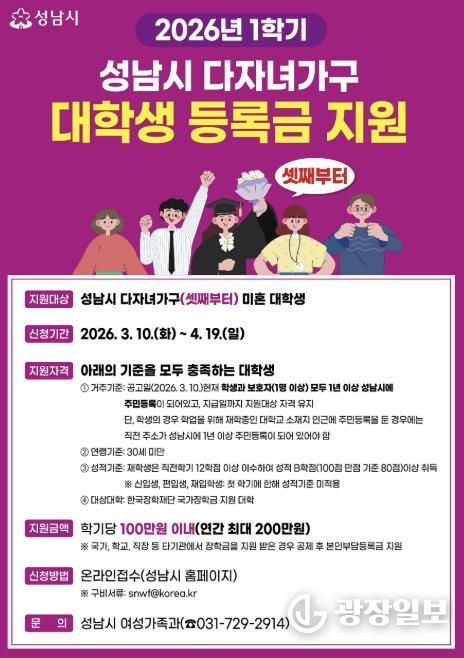 광장일보 주재영 기자 | 성남시는 다자녀가구의 경제적 부담을 덜기 위해 셋째 이상 대학생에게 학기당 최대 100만원(연 200만원)의 등록금을 지원한다고 12일 밝혔다.
