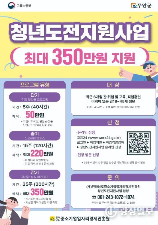 모집은 예산 소진 시까지 상시 진행되며 신청은 고용24 누리집 또는 전남일자리종합센터(무안군 삼향읍 오룡3길 2)를 방문해 할 수 있다.