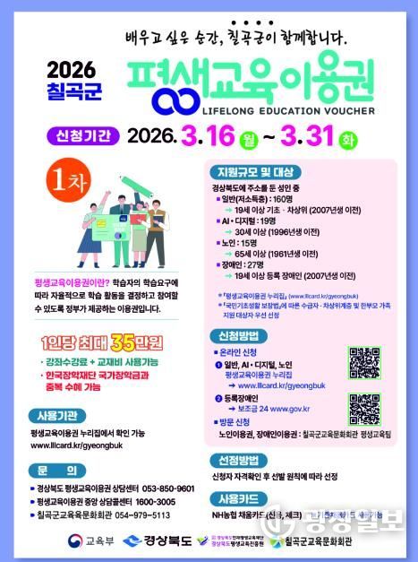 광장일보 주재영 기자 | 칠곡군은 저소득층, 노인, 장애인 등 교육 소외계층 221명을 대상으로 ‘2026년 평생교육이용권’ 지원사업을 추진한다.