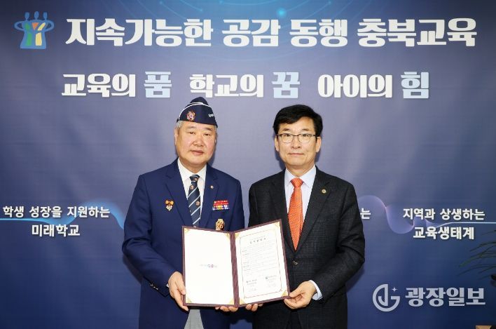 광장일보 이현나 기자 | 충청북도교육청은 12일, 도교육청 교육감실에서 충청북도재향군인회(회장 조성보)와 학교안전보안관 사업 운영을 위한 업무협약(MOU)을 체결했다고 밝혔다.