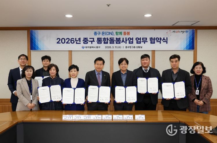 광장일보 주재영 기자 | 대구 중구는 지난 11일 구청 상황실에서 ‘중구 온(ON), 함께 돌봄’ 통합돌봄 지역특화사업의 안정적 추진을 위해 관내 7개 기관과 업무협약을 체결하고, 민·관 협력 기반의 지역 통합 돌봄 체계 구축에 나섰다.