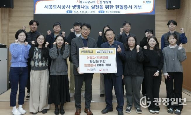 광장일보 주재영 기자 | 시흥도시공사는 지난 11일 임직원 단체 헌혈 행사를 통해 직원들에게 기부받은 ‘헌혈증 131매’를, 대한산업보건협회 한마음혈액원에 전달하면서 ‘생명 나눔’을 실천했다고 밝혔다.