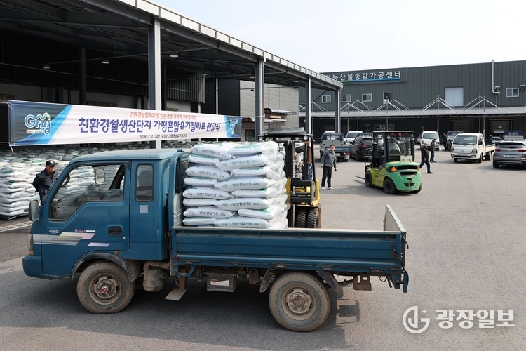 가평군농업기술센터는 11일 친환경농산물집하장 앞에서 '2026년 친환경쌀생산단지 가평혼합유기질비료 전달식'을 개최했다. 행사에는 서태원 군수, 친환경쌀생산단지 회원, 관련 기관 및 단체 관계자들이 참석했다. 이날 전달된 가평혼합유기질비료는 20kg 포대 기준 1만 4,070포, 총 282톤 규모로, 친환경 학교급식 생산단지에 소속된 6개 읍면 37개 단지 429농가에 순차적으로 공급된다.