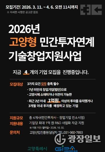 광장일보 주재영 기자 | 고양산업진흥원이 유망 기술창업기업의 투자 유치와 기술 고도화를 지원하기 위한 ‘2026년 고양형 민간투자연계 기술창업지원사업’에 참여할 창업기업을 모집한다.