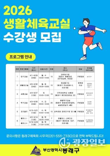 광장일보 주재영 기자 | 부산 동래구는 지역 주민의 생활체육 참여 확대와 건강한 여가 활동 지원을 위해 ‘2026년 상반기 생활체육교실’ 수강생을 모집한다고 밝혔다.
