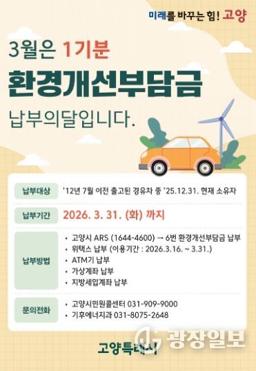 광장일보 주재영 기자 | 고양특례시는 노후 경유 차량 소유자를 대상으로 2026년 상반기 정기분 환경개선부담금을 부과한다고 12일 밝혔다.